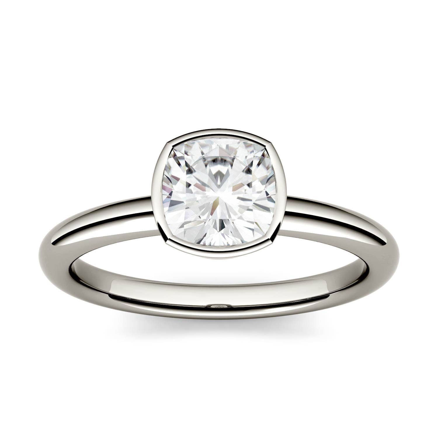 1.10 CTW DEW Cushion Forever One Moissanite Bezel Set Solitaire Engagement Ring in 14K White Gold