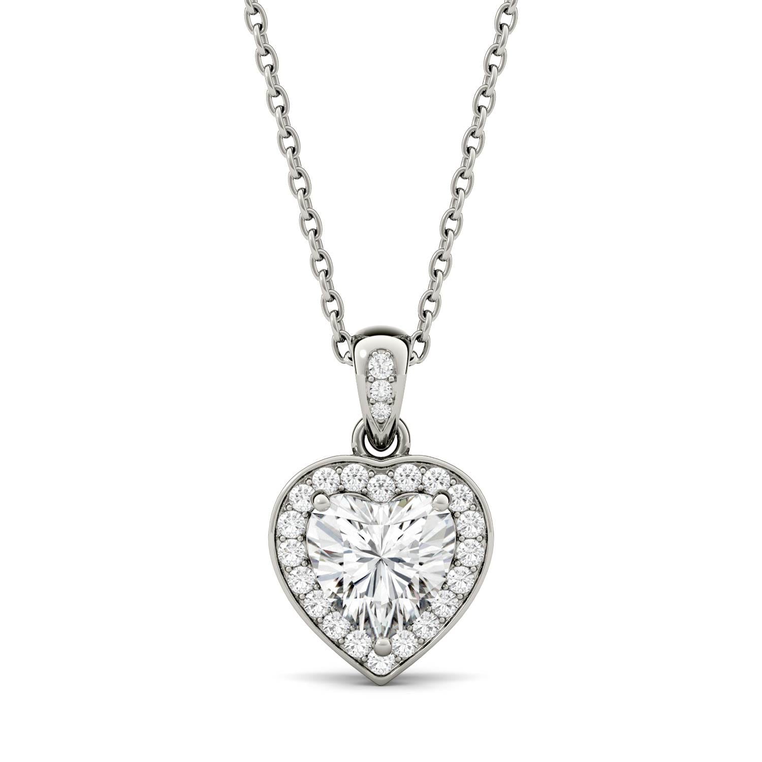 0.95 CTW DEW Heart Forever One Moissanite Bezel Set Halo Pendant in 14K White Gold