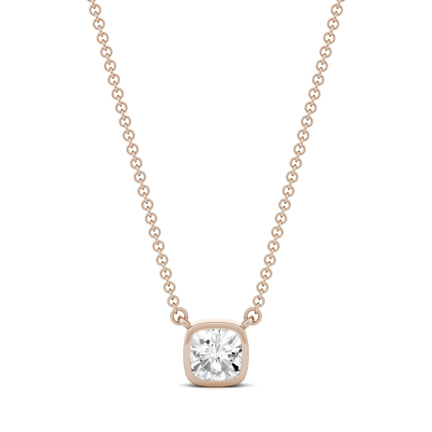 0.60 CTW DEW Cushion Forever One Moissanite Bezel Solitaire Necklace in 14K Rose Gold