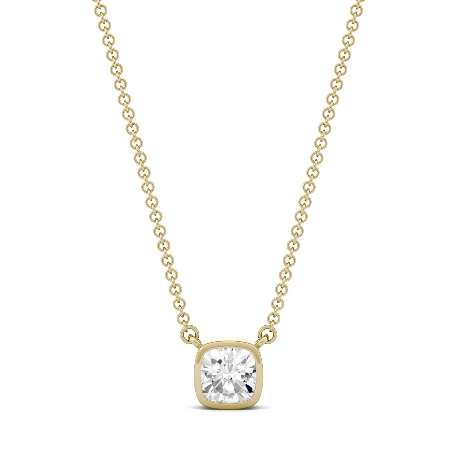 0.60 CTW DEW Cushion Forever One Moissanite Bezel Solitaire Necklace in 14K Yellow Gold