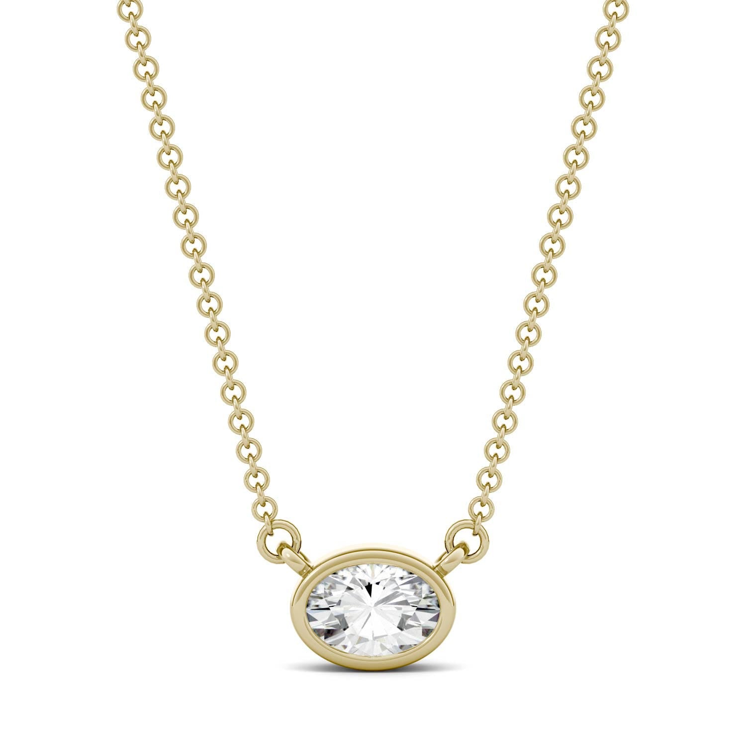 0.50 CTW DEW Oval Forever One Moissanite East-West Bezel Necklace in 14K Yellow Gold