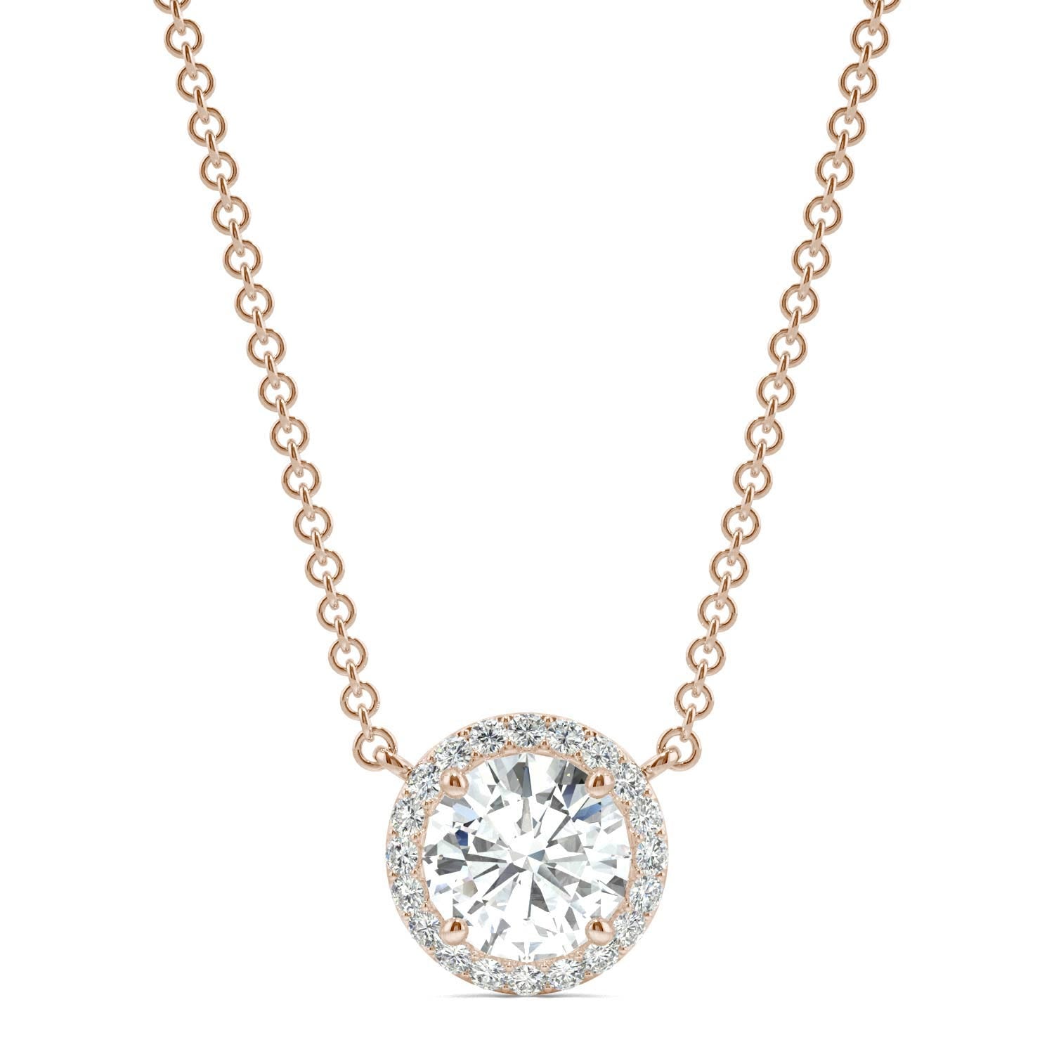 2.13 CTW DEW Round Forever One Moissanite Cluster Halo Signature Necklace in 14K Rose Gold