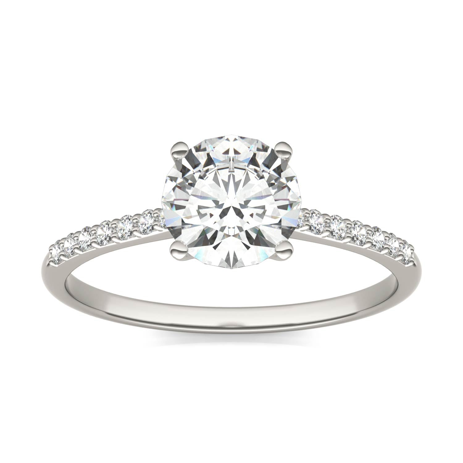 1.19 CTW DEW Round Forever One Moissanite Signature Side Stone Round Engagement Ring in 14K White Gold