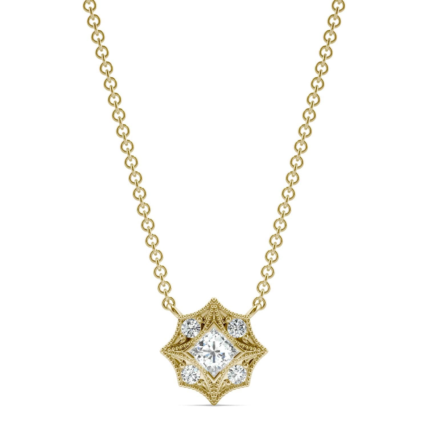 0.24 CTW DEW Princess Forever One Moissanite Signature Milgrain Necklace in 14K Yellow Gold
