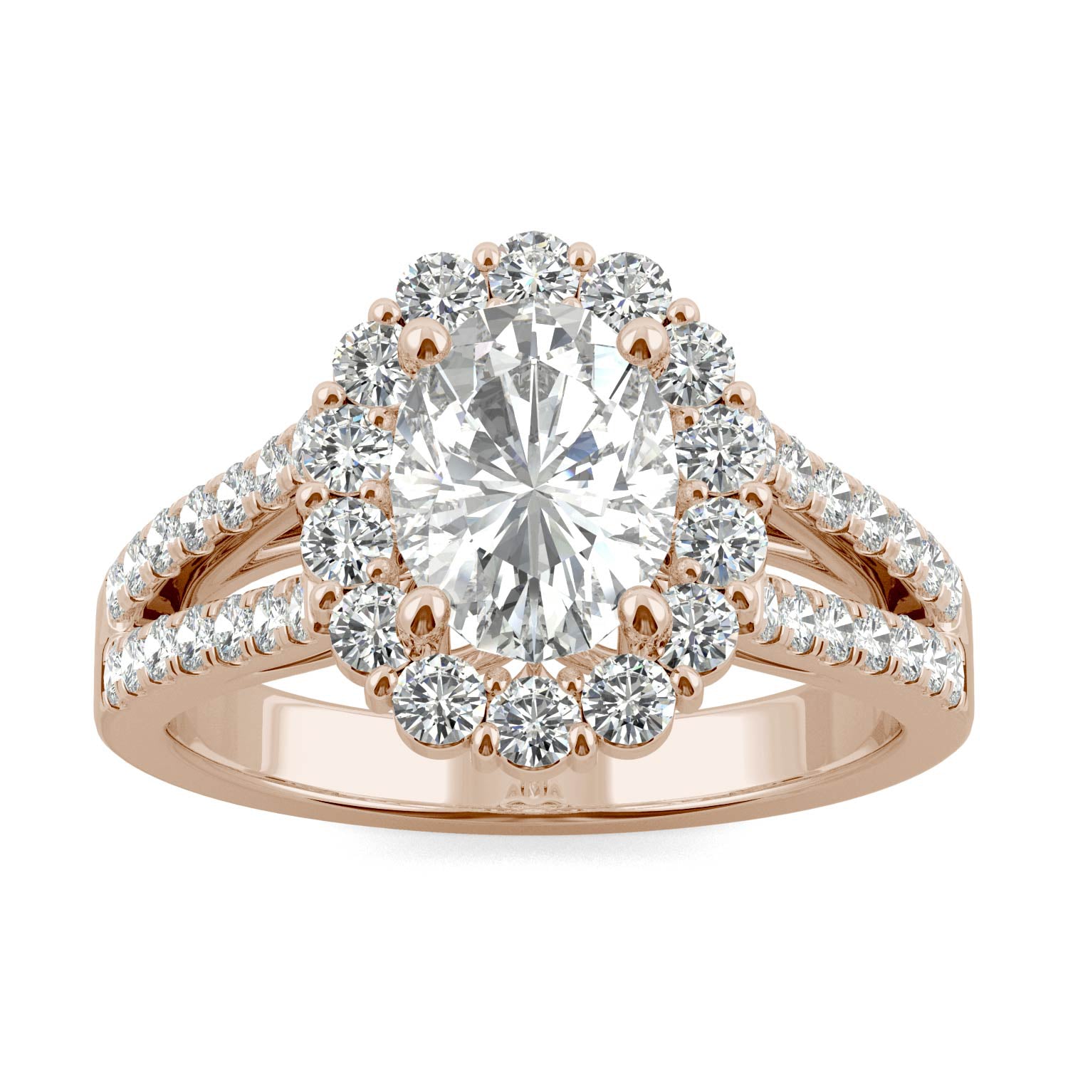 2.14 CTW DEW Oval Forever One Moissanite Signature Halo Split Shank Engagement Ring in 14K Rose Gold