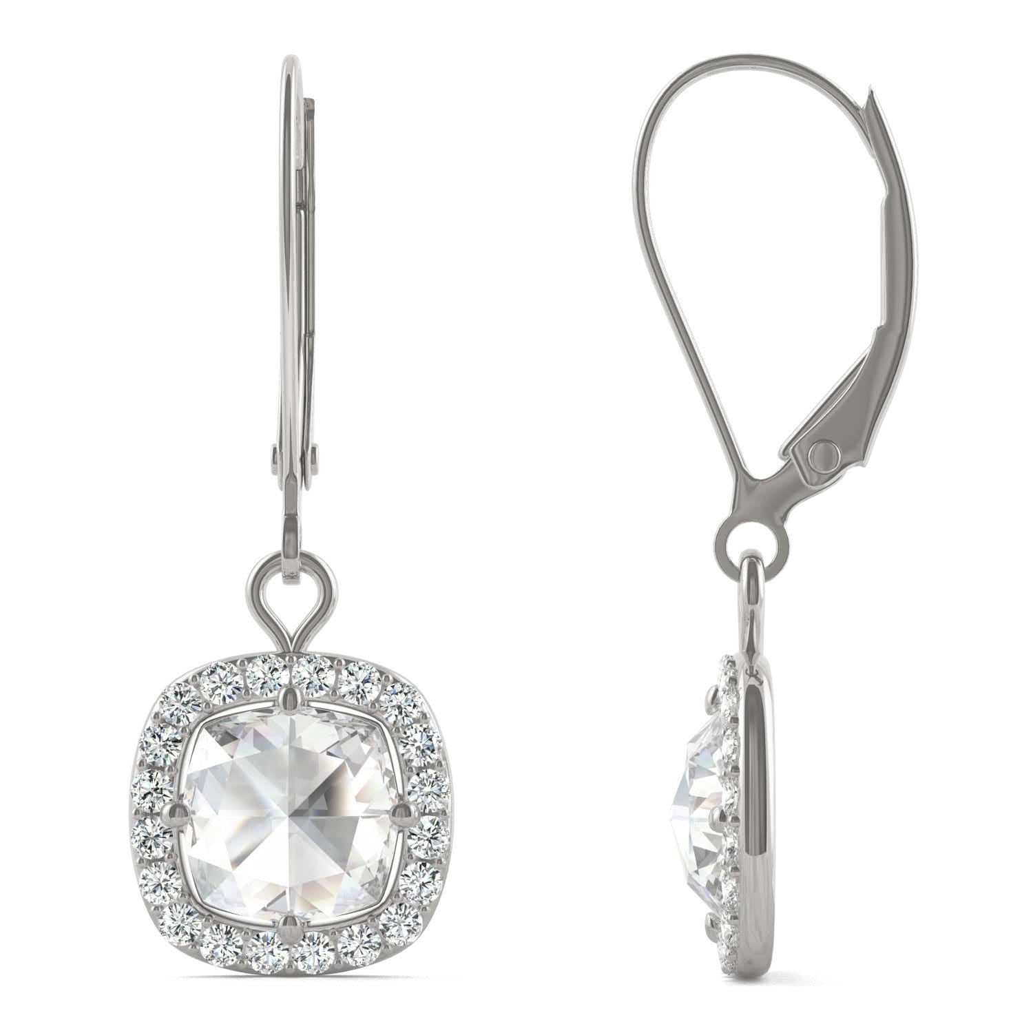 1.46 CTW DEW Cushion Forever One Moissanite Halo Drop Earrings in 14K White Gold