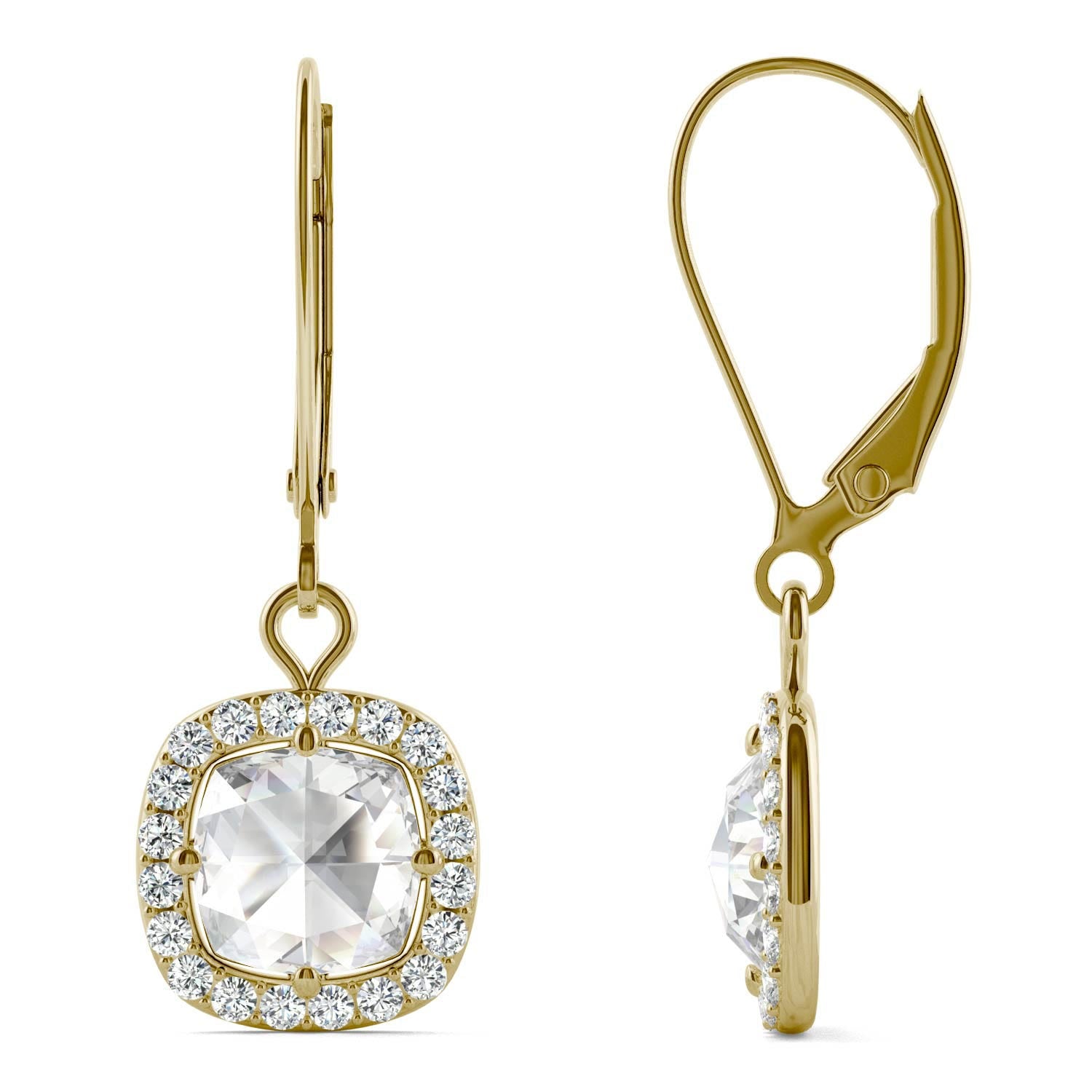 1.46 CTW DEW Cushion Forever One Moissanite Halo Drop Earrings in 14K Yellow Gold