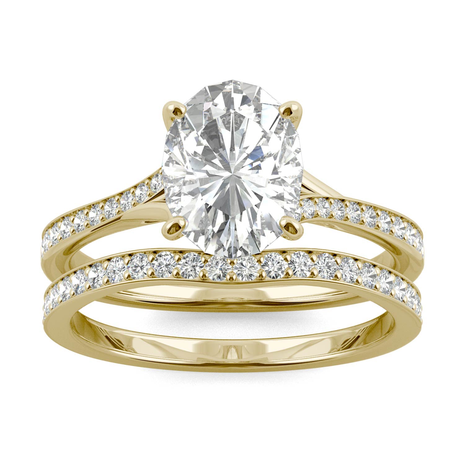 2.43 CTW DEW Oval Forever One Moissanite Side Stone with Hidden Halo Bridal Set Ring in 14K Yellow Gold