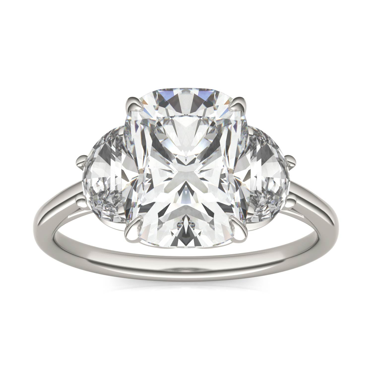 3.96 CTW DEW Elongated Cushion Forever One Moissanite Signature Three Stone Engagement Ring in 14K White Gold