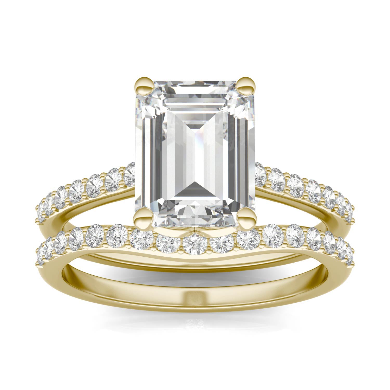 3.01 CTW DEW Emerald Forever One Moissanite Signature Solitaire with Side Accents Wedding Set in 14K Yellow Gold