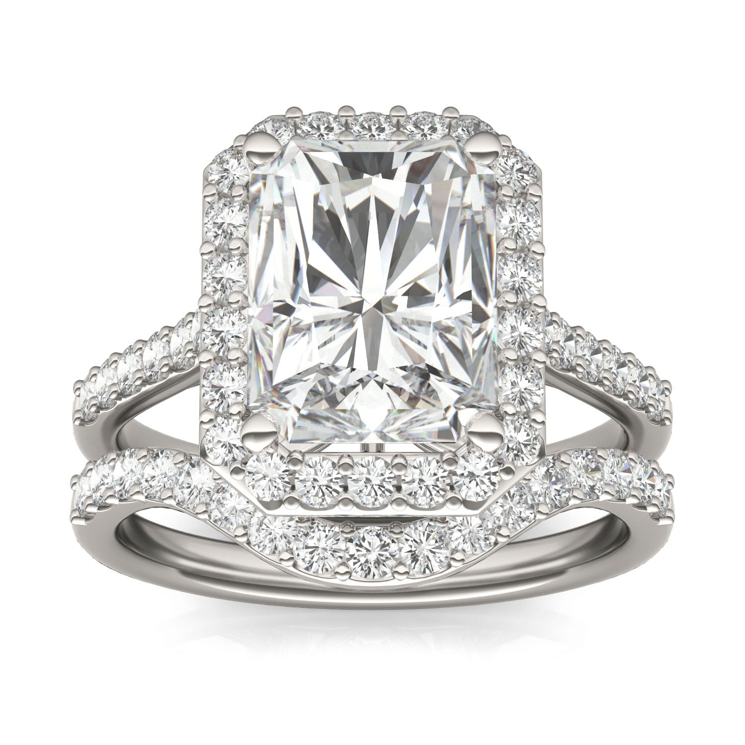 4.82 CTW DEW Radiant Forever One Moissanite Signature Halo with Side Accents Wedding Set in 14K White Gold