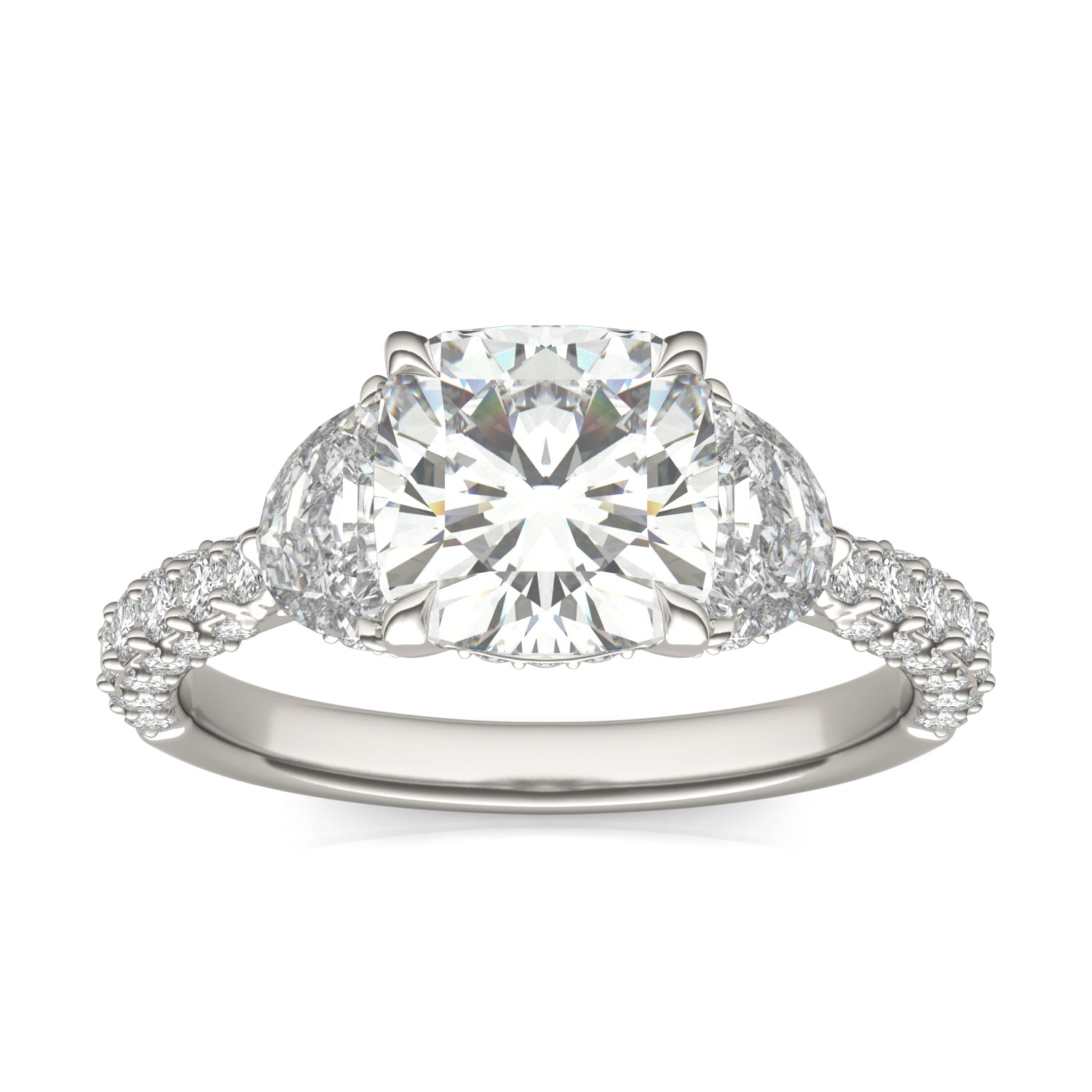 3.35 CTW DEW Cushion Forever One Moissanite Three Stone Pave Engagement Ring 14K White Gold