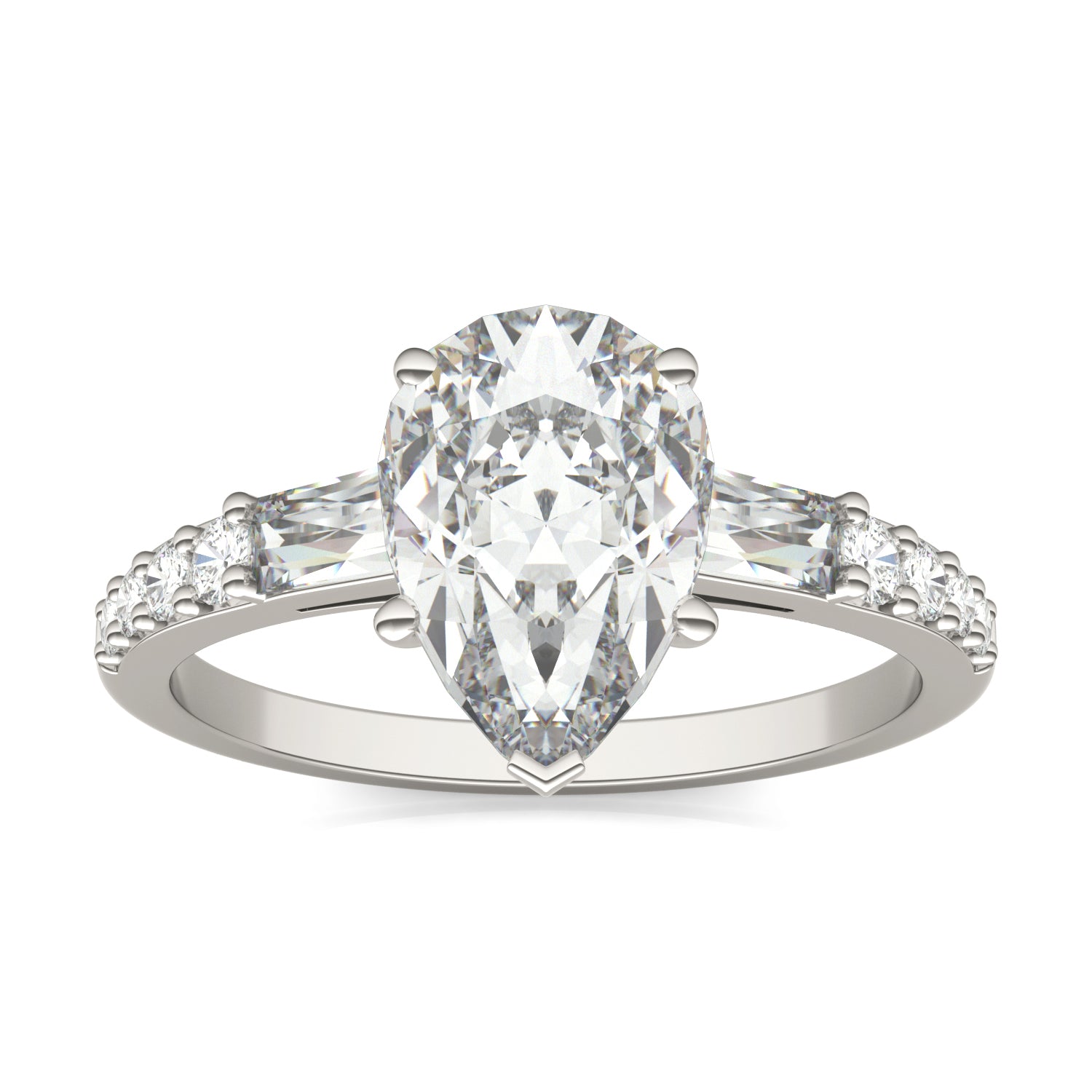 2.61 CTW DEW Pear Forever One Moissanite Three Stone with Side Accents Engagement Ring 14K White Gold