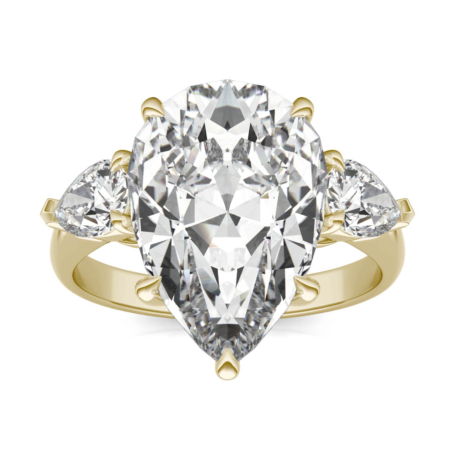 7.62 CTW DEW Pear Forever One Moissanite Three Stone Ring 18K Yellow Gold, Color Grade G, Ring Size 7.0